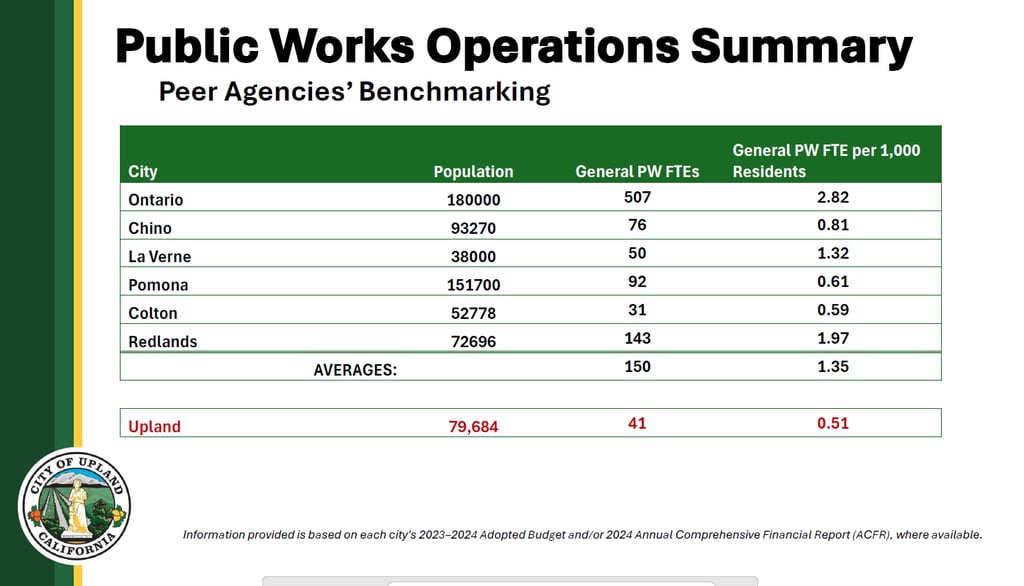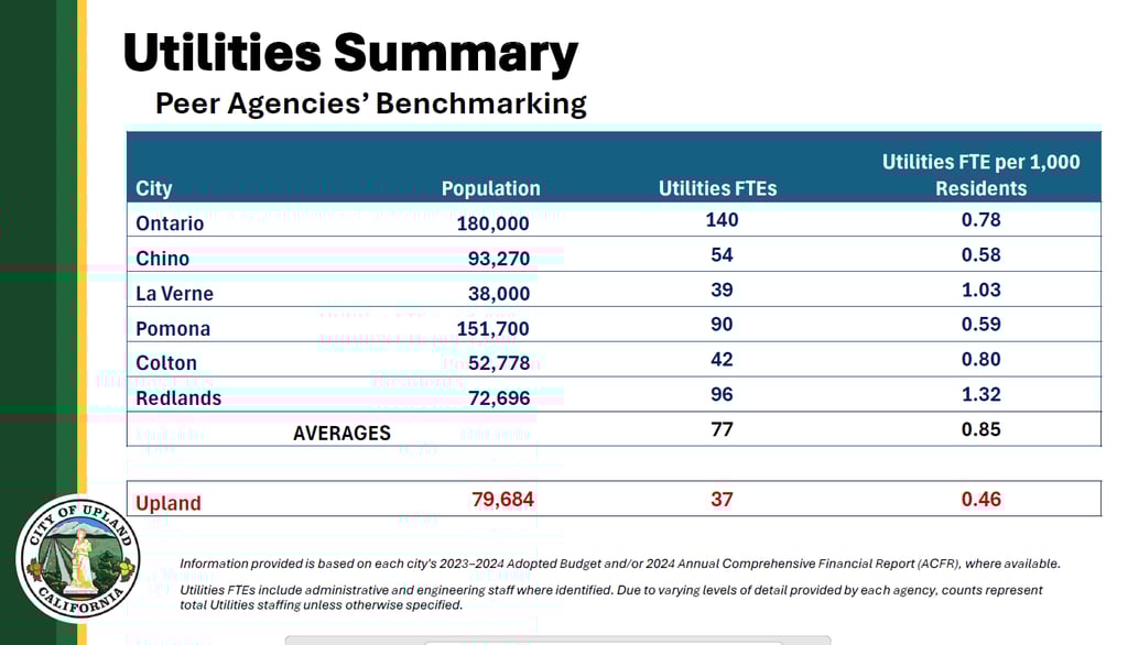 Analysis of Upland’s staffing relative to peer agencies reveals an unsustainable gap. Neighboring cities average 1.35 Public Works employees per 1,000 residents. Upland has just 0.51—barely a third of that standard. Similarly, in Utilities, Upland staffs 0.46 employees per 1,000 residents, while the regional average is nearly double.