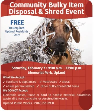 Upland residents are invited to take advantage of a FREE bulky item disposal and document shredding event this Saturday.